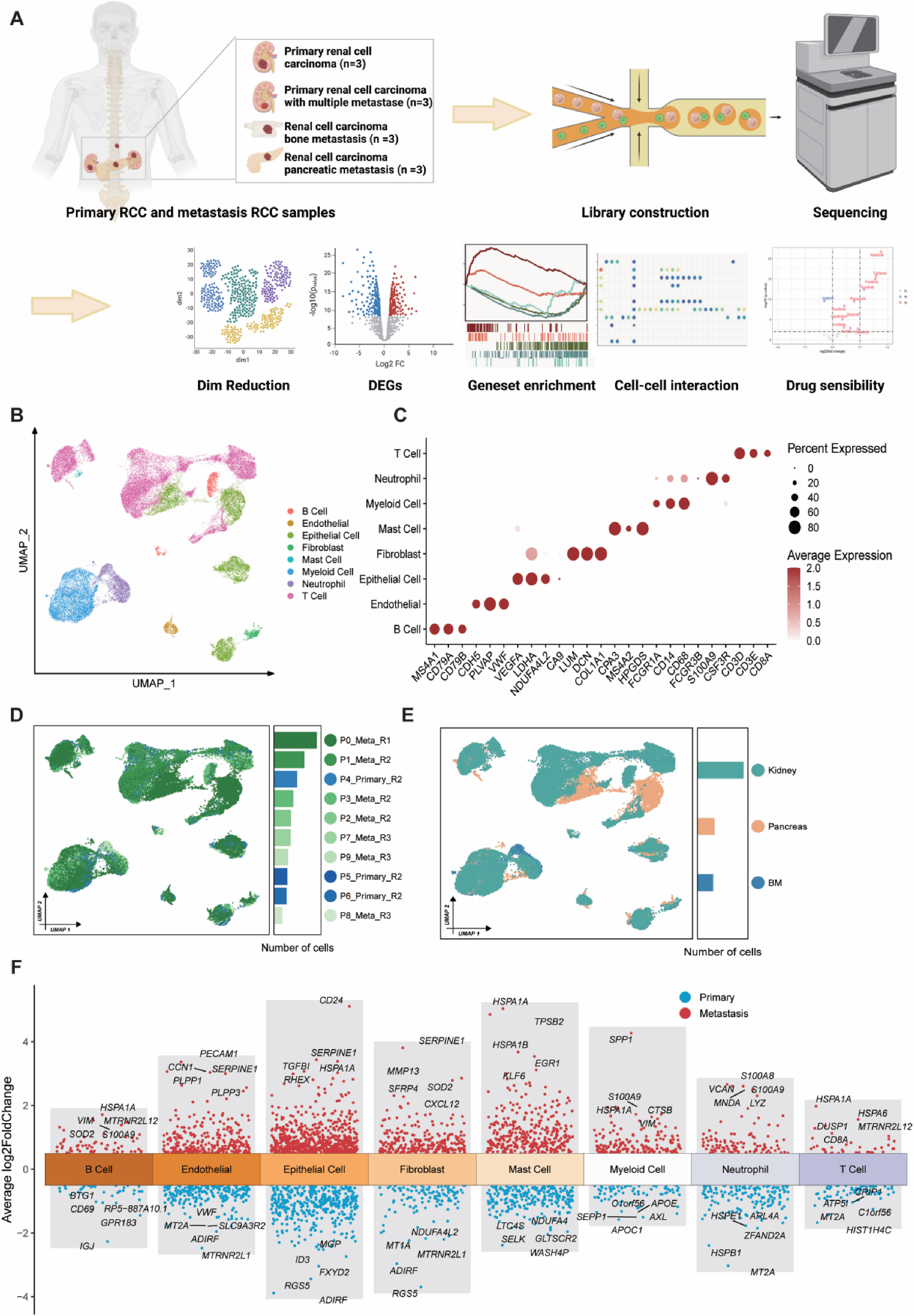 此外,在UMAP還原中對樣本進行了單獨分析,結果顯示出相當大的異質性(圖1D和E)。同時,RCCbm樣本中的細胞比其他部位的樣本少(圖1E)。隨后計算了每種細胞類型中轉移樣本和原發(fā)性RCC樣本的不同表達基因(DEGs)(圖1F)。研究發(fā)現(xiàn),一些功能基因如CD8A、S100A8/9在轉移樣本中上調。同時,還發(fā)現(xiàn)了幾種細胞類型的功能轉換,例如,成纖維細胞中MMP13和CXCL12的上調與轉移性TME中細胞外基質建模和炎癥信號轉導有關。