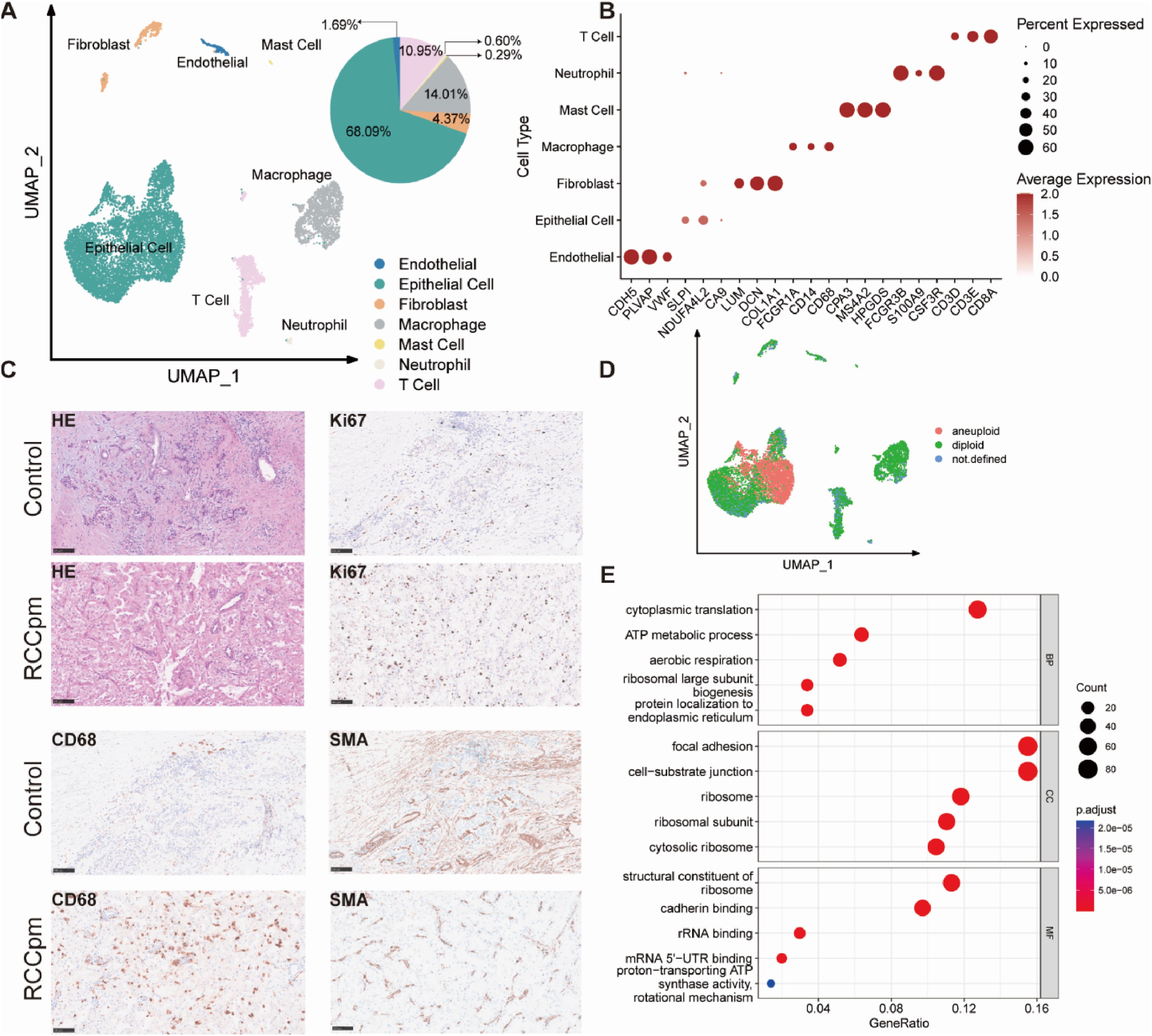 作者進一步研究了RCCpm TME中細胞的核型。幾乎所有的非整倍體細胞都出現(xiàn)在上皮細胞中,這些細胞被認為是高度惡性細胞,而其他二倍體上皮細胞則被定義為低惡性潛能細胞或正在發(fā)生癌變的上皮細胞(圖2D)。計算了非整倍體上皮細胞與其他上皮細胞的不同表達基因(DEGs)。隨后,DEGs的基因功能富集結果顯示,其變化主要集中在能量代謝(ATP代謝過程、有氧呼吸等)、蛋白質合成(細胞質翻譯、蛋白質定位到內質網(wǎng)和核糖體等)和細胞粘附(病灶粘附、細胞-基質連接和粘附素結合等)方面(圖2E)。所有這些功能變化都與腫瘤的進展密切相關,表明RCCpm TME具有活躍的侵襲性。